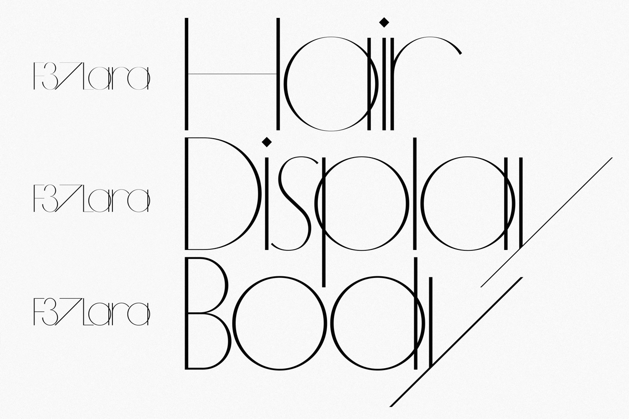 Lara is a reworking of a font designed for The Sanahunt Times, a luxury department store in Kyiv, Ukraine. F37 Lara was updated by F37 Foundry with a full lowercase set, as well as extended Latin and Cyrillic support. The font comes in 3 weights: the original Hair weight, as well as new Display and Body weights. Both of these weights thicken the thinnest strokes to ensure the font can work elegantly across all sizes. F37 Lara also contains a Stylistic Set that overlaps certain glyphs for that extreme Herb Lubalin kerning vibe. Other Stylistic Sets found in the font are a simple lowercase set, a wide and narrow set and alternate numeral set to name a few. F37 Lara is available at f37foundry.com/f37x/f37-lara