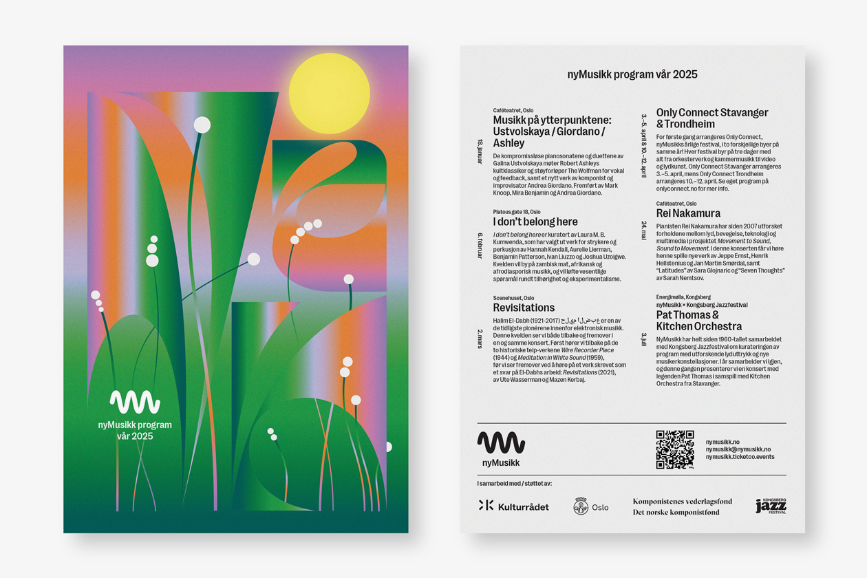 A5 flyer and poster promoting nyMusikk’s vår (spring) season of events. Created in partnership with ANTI Oslo.