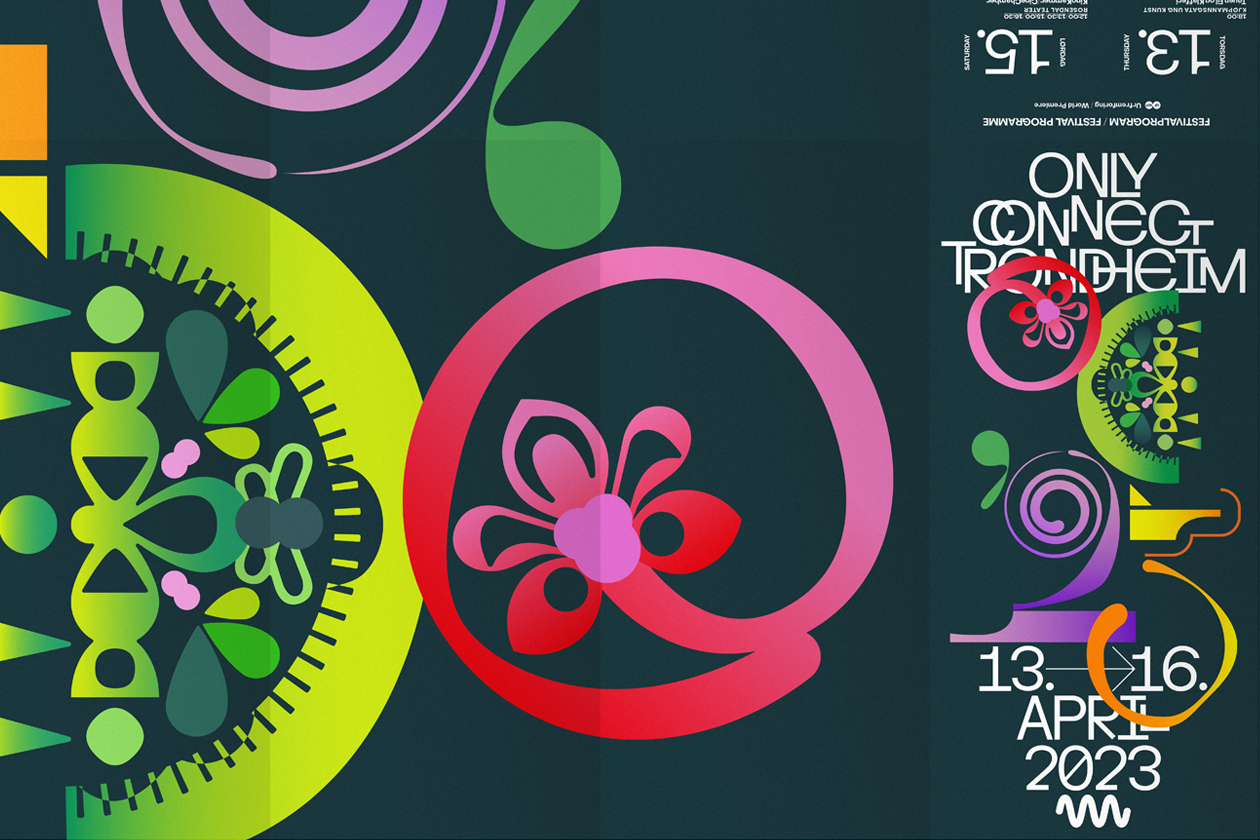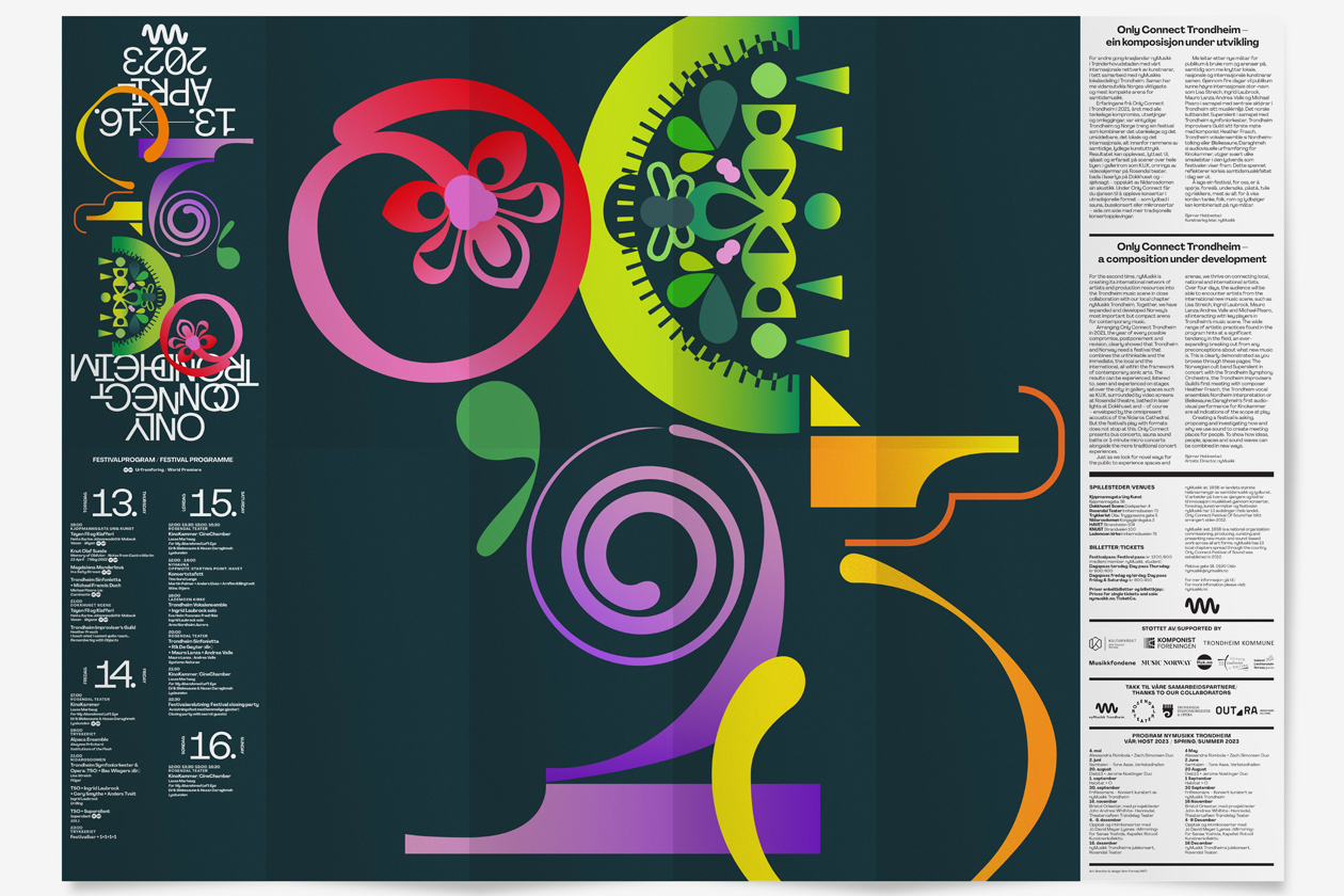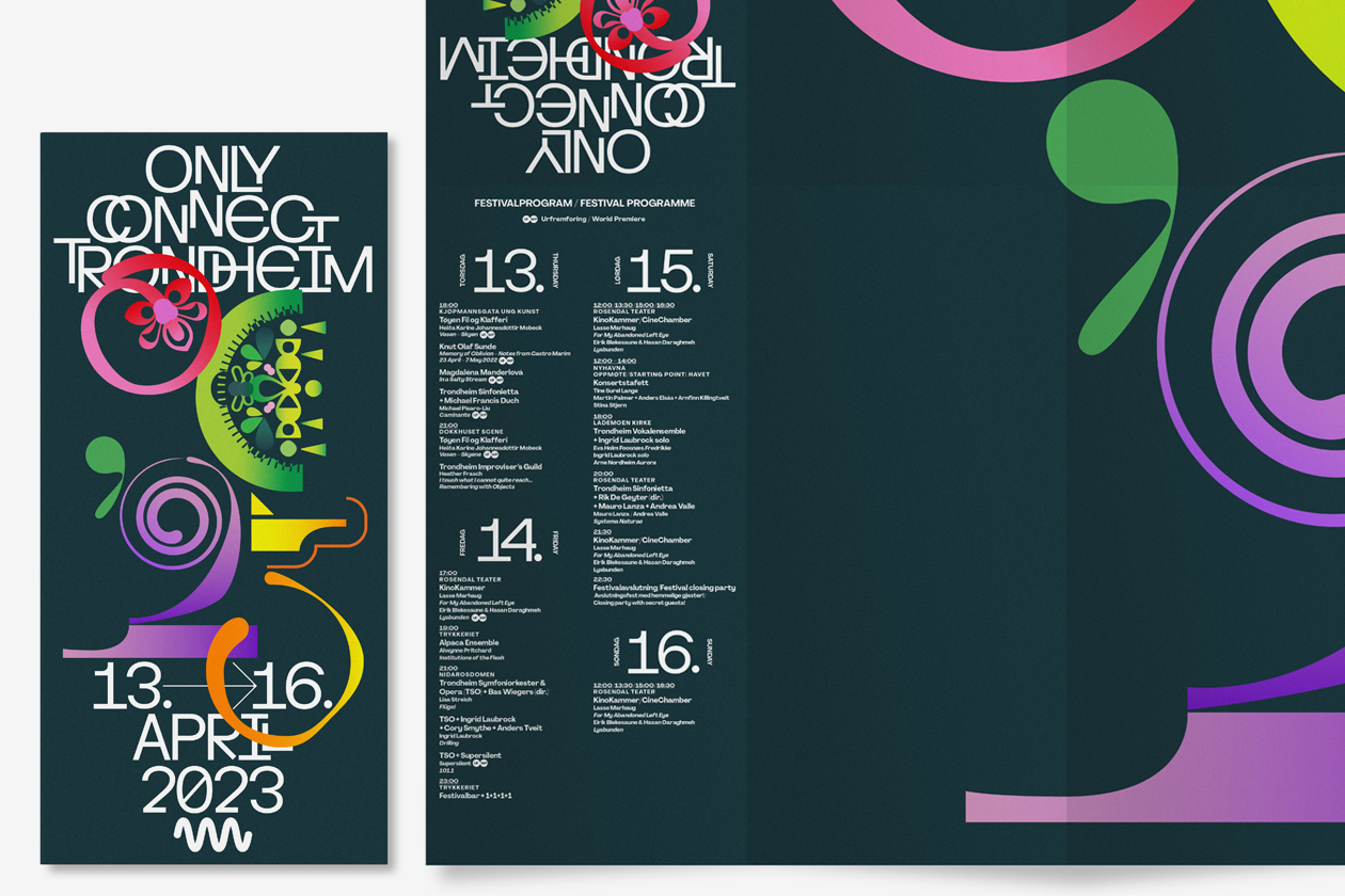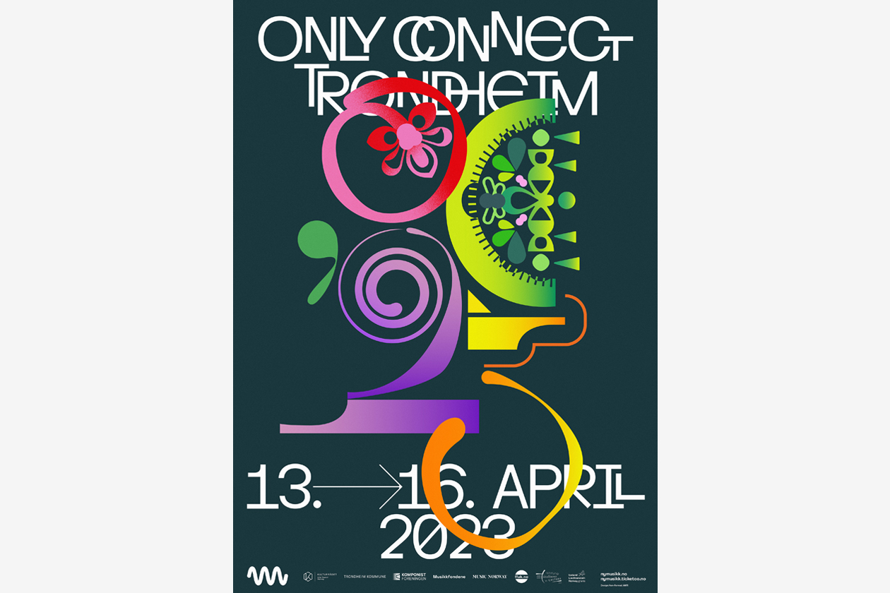 Poster and program design for the 2023 Only Connect Trondheim music festival organised by nyMusikk, the leading promoter of contemporary music in Norway.