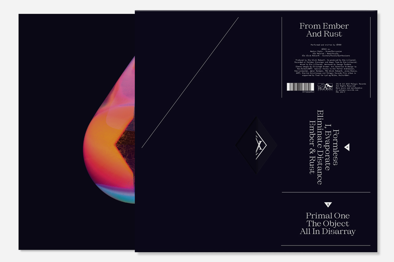 Music packaging for the From Ember And Rust album by Norwegian sludge metal power trio Sâver, released by Pelagic Records. The LP sleeve features stills from an animation of a teardrop/wayfinder created by 3D maestro Christoph Gromer. Created in partnership with ANTI Oslo.